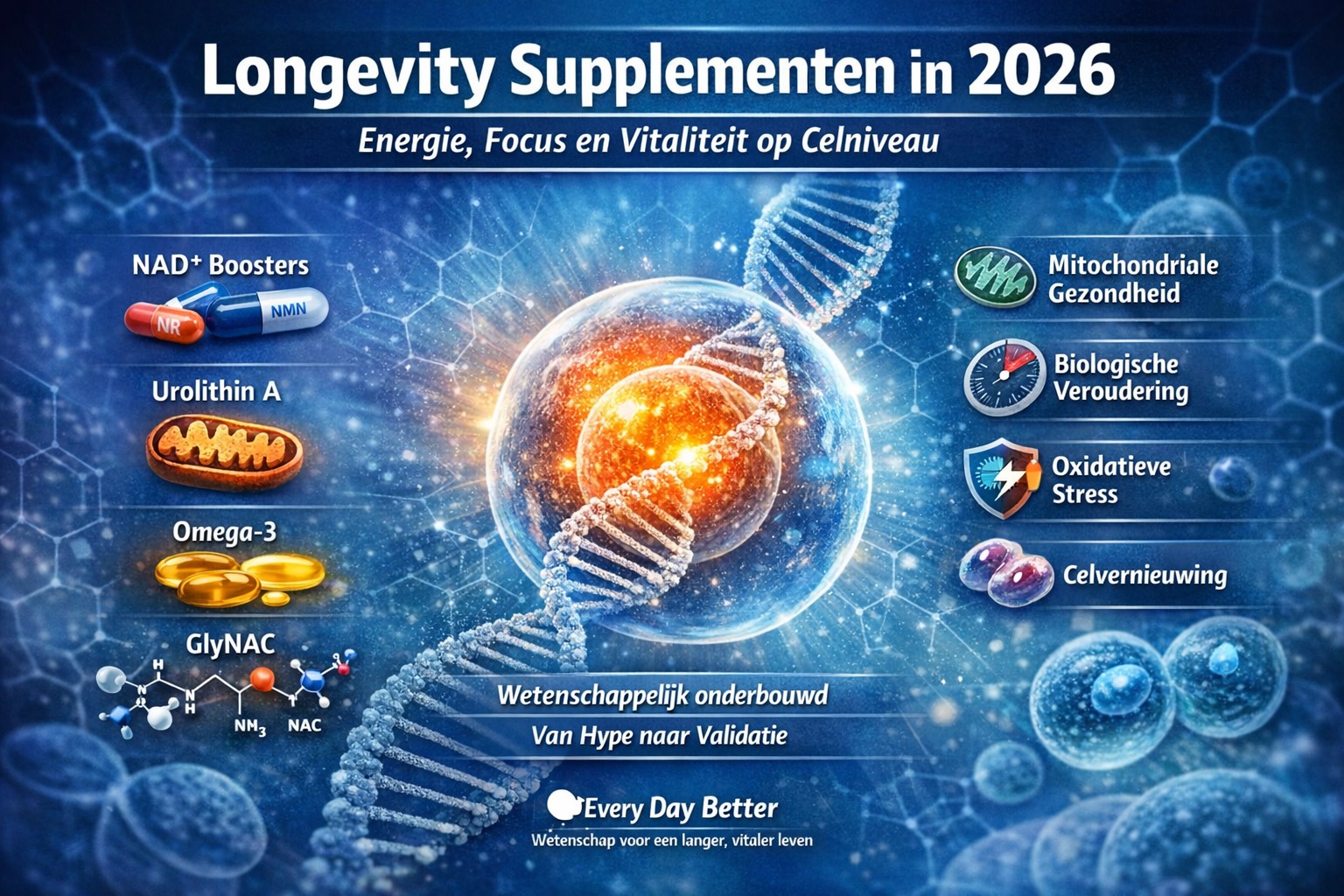 Bij Every Day Better volgen we deze ontwikkeling op de voet. Niet om trends klakkeloos te volgen, maar om te begrijpen wat echt bijdraagt aan energie, focus en vitaliteit op celniveau. In dit artikel nemen we je mee in de stand van de wetenschap begin 2026 én kijken we vooruit: wat kun je realistisch verwachten van longevity supplementen in de komende jaren?