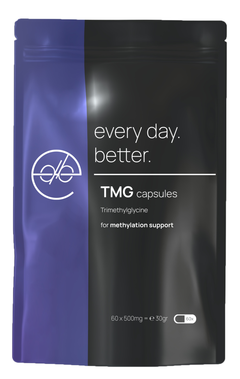 TMG (Trimethylglycine), also known as betaine, is a powerful methyl group donor that plays an essential role in the body’s methylation process. Methylation is crucial for energy production, DNA repair, detoxification, brain function, and maintaining homocysteine balance.