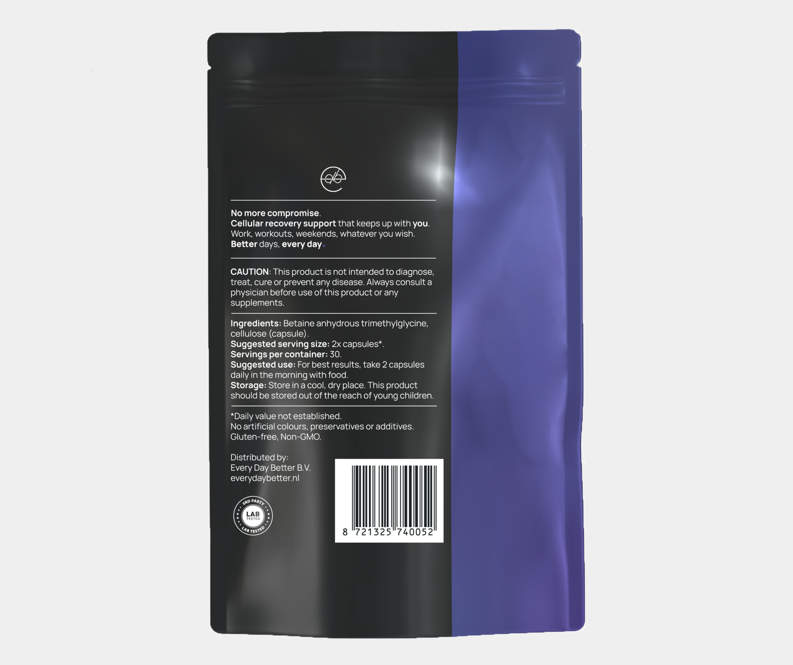 The TMG Capsules from Every Day Better contain a pure, effective dosage of 500 mg per capsule, without unnecessary additives. Ideal as support for NMN, NAD⁺ strategies, or with an increased methylation need.